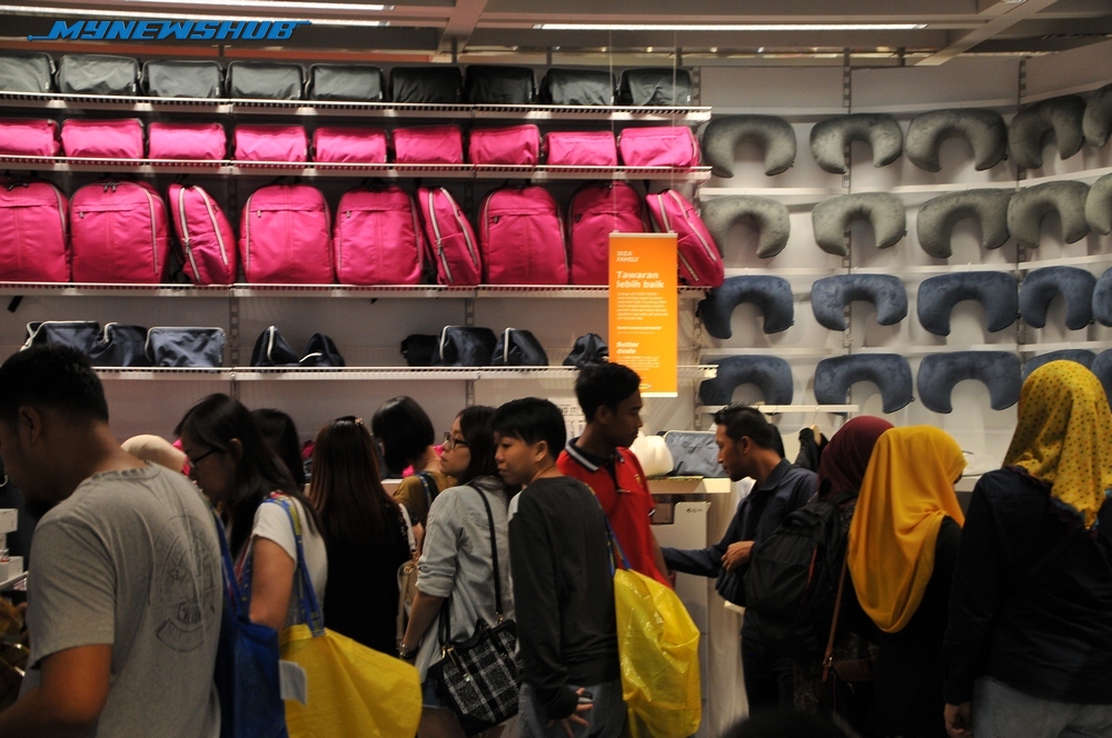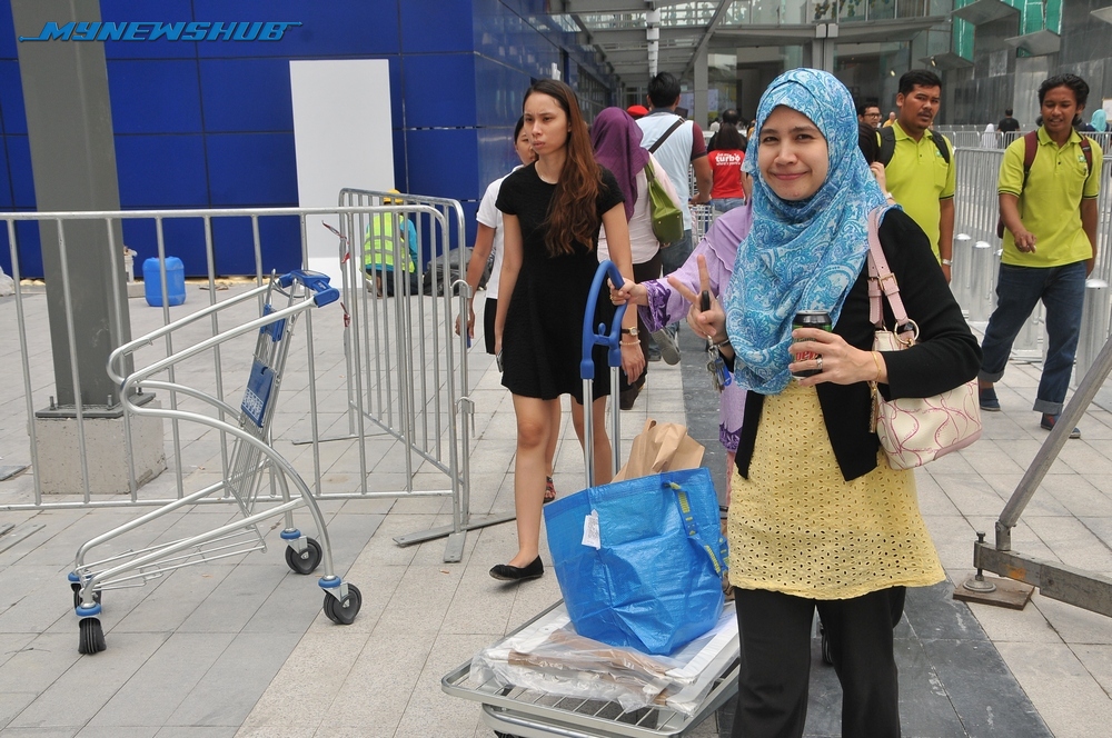 Haaa.. sampai sesak jalan raya dibuatnya.. nasib baik ada abang-abang polis yang mengawal keadaan agar lebih lancar!Tak kira panas terik, orang ramai tetap tidak mahu terlepas mengunjungi gedung IKEA yang baru dibuka.Pintu gerbang gudang dengan sepanduk besar yang bertulis ‘Selamat Datang’ dalam bahasa Sweden.Orang ramai sibuk mencari kelengkapan rumah dengan harga yang berpatutan!