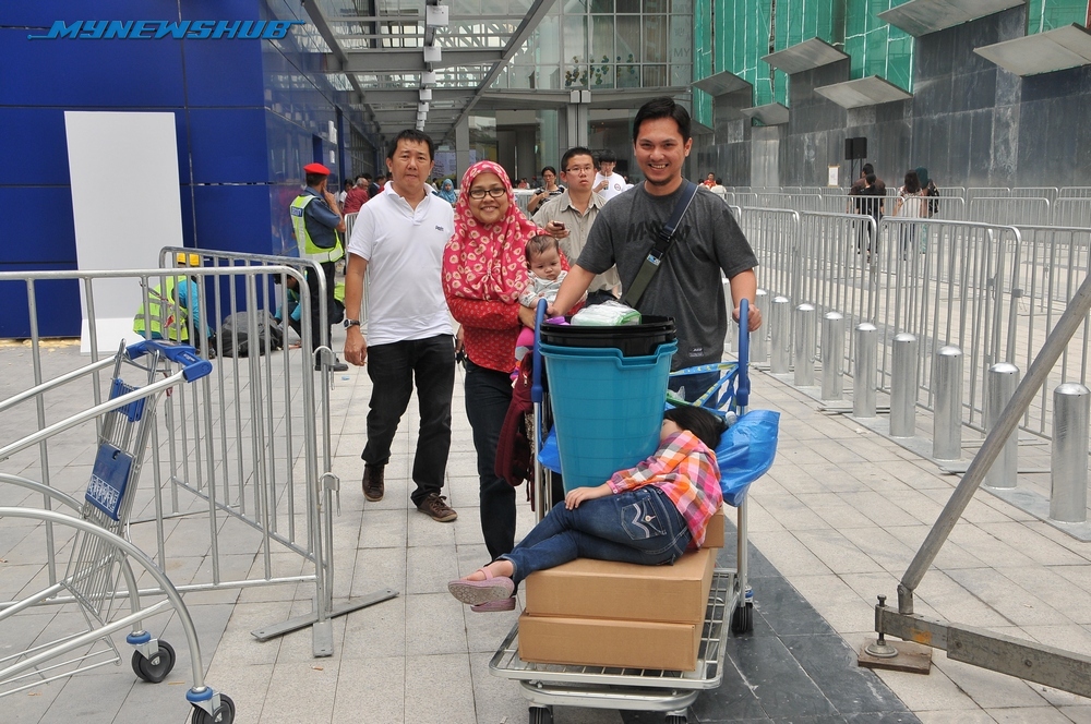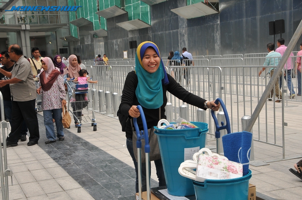 Orang ramai mula beratur dan membanjiri pusat membeli-belah itu sejak awal pagi bagi merebut barangan percuma serta mencari kelengkapan rumah dengan harga yang berpatutan.