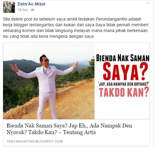 Bagaimanapun, baru-baru ini heboh di laman sosial apabila sebuah blog yang tidak bertanggungjawab mengeluarkan sebuah artikel dan tajuk kononnya AC Mizal telah mengeluarkan kata-kata bernada bongkak berbunyi, “Bienda nak saman saya? Jap, ada nampak den goyang? takdo kan?”.