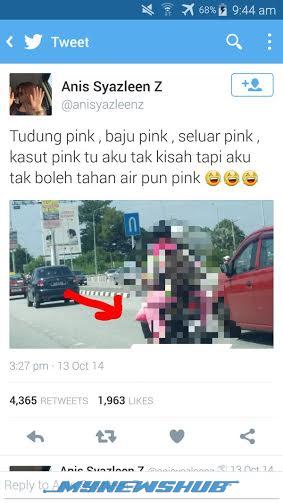 “Tudung pink, baju pink, seluar pink, kasut pink tu aku tak kisah tapi aku tak boleh tahan air pun pink,” tulis Anis.