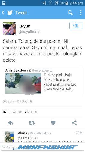“Salam. Tolong delete post ini. Ini gambar saya. Saya minta maaf. Lepas ni saya bawa air milo pulak. Tolonglah delete,” tulisnya.