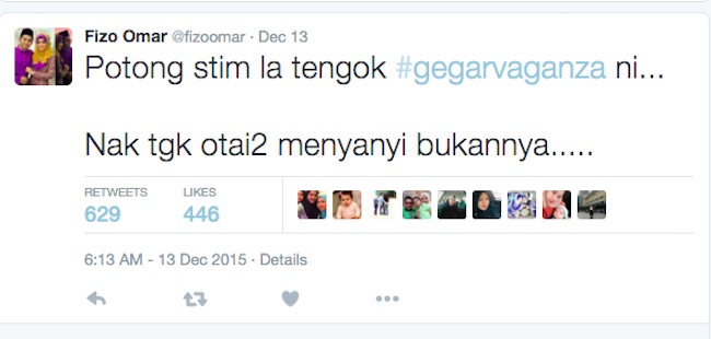 “Tahniah diucapkan kepada semua pemenang #gegarvaganza musim kedua dan juga penaja utama serta pihak astro diatas kejayaan menganjurkan program yg menjadi satu fenomena.