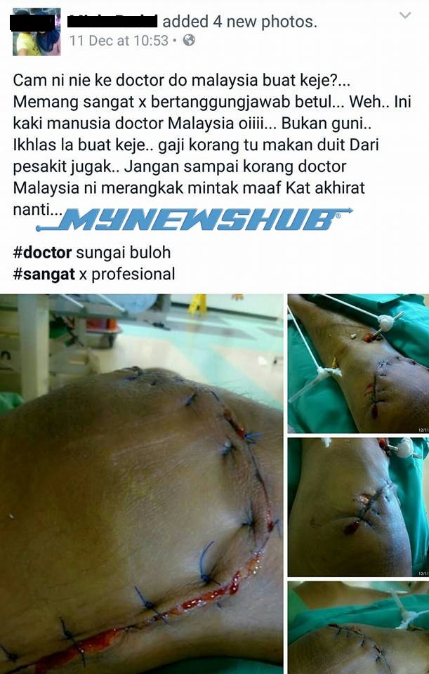 HEBOH di laman sosial baru-baru ini, apabila seorang wanita memuat naik beberapa gambar di Facebook menunjukkan jahitan pada kaki seorang pesakit bersama status yang menyelar cara kerja doktor di Malaysia yang disifatkan tidak bertanggungjawab.