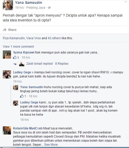 “Saya tahu ‘apron’ menyusukan anak kini banyak dijual di kedai barangan bayi. Apa salahnya gunakan kemudahan berkenaan untuk membaluti dada kita? Kalau mahal, selendang pun boleh. Mungkin ada yang kurang bersetuju dengan pendapat saya iniâ€Â