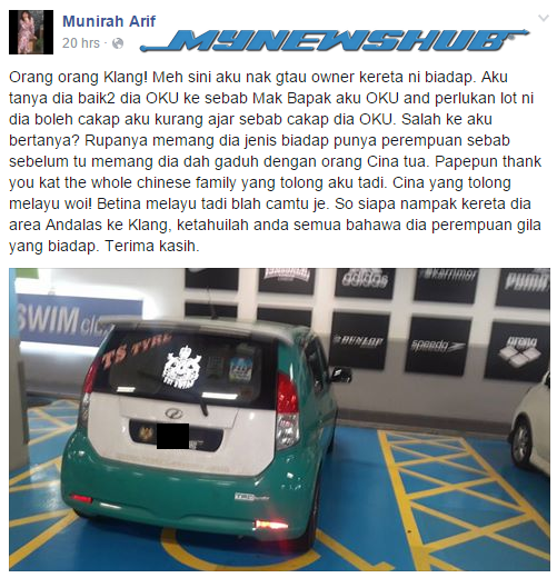Jadi kepada sesiapa yang ternampak kereta dia di kawasan Andalas ke Klang, ketahuilah bahawa dia memang perempuan yang gila serta biadab. Terima kasih,” tulisnya.