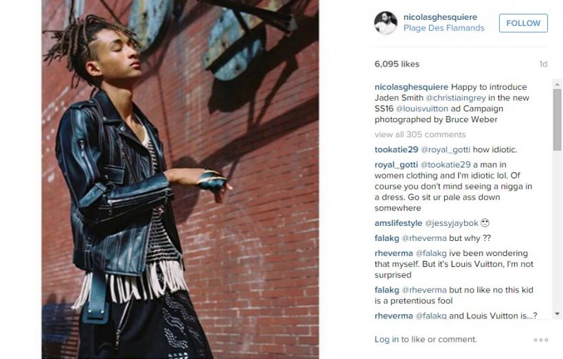 Pemilihan Jaden ini hanya diketahui setelah Pengarah Kreatif Louis Vuitton, Nicholas Ghesquiere, memuat naik sekeping gambar Jaden yang memakai skirt pendek dan jaket kulit di laman instagramnya dengan kapsyen “Happy to introduce Jaden Smith @christiaingrey in the new SS16@louisvuitton ad Campaign photographed by Bruce Weber.”