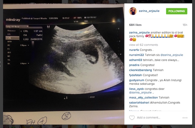 SEKALUNG tahniah diucapkan kepada pelakon dan model Zarina Anjoulie yang kini disahkan hamil anak pertama.
