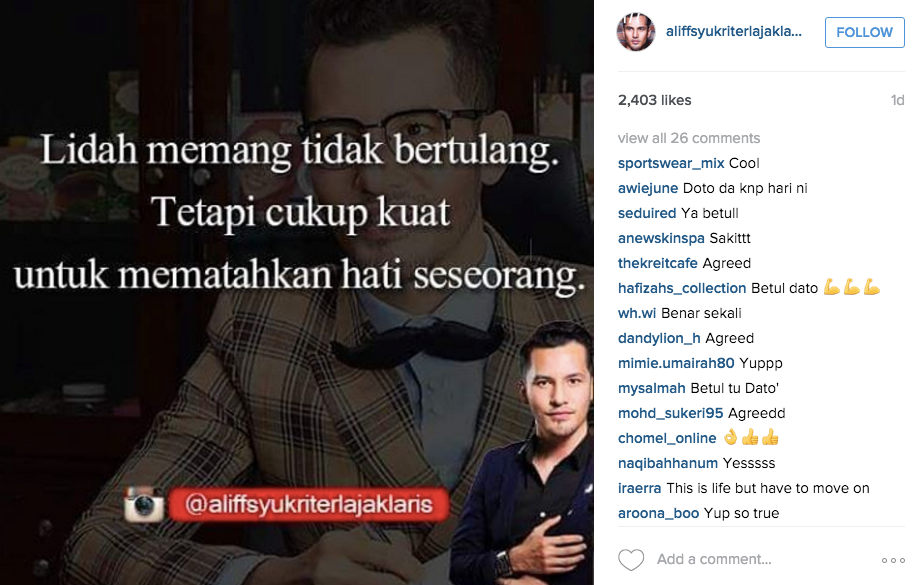 PEMINAT dan pengikut akaun instagram Dato’ Aliff Syukri atau lebih dikenali sebagai Abang Terlajak Laris mula beranggapan rumah tangga aliff kini sedang mengalami masalah ekoran sebuah gambar yang dimuat naik olehnya.