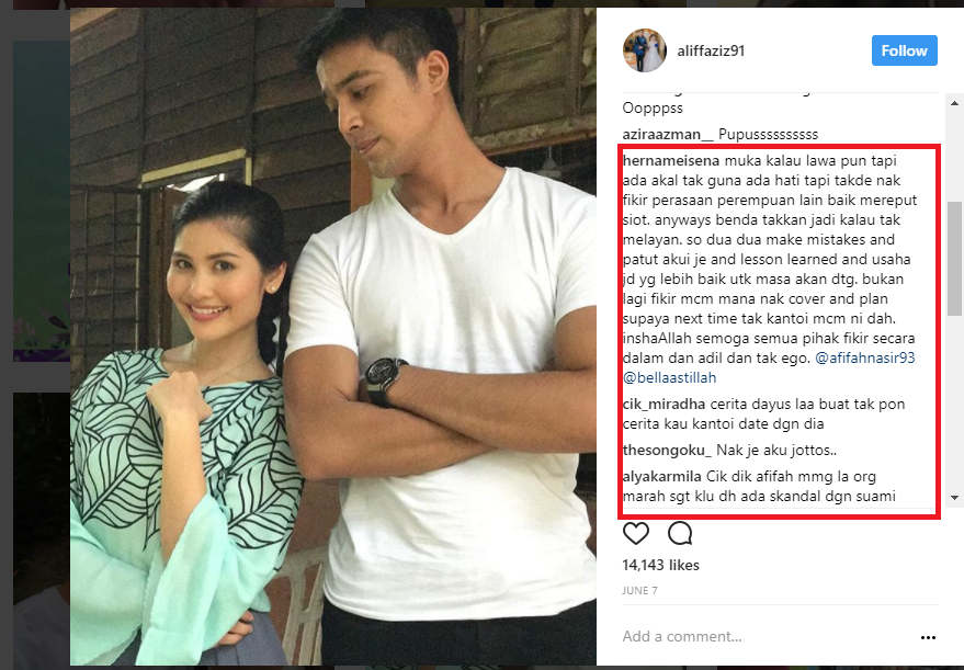 Bella Astillah telah mendedahkan kisah kecurangan suami kesayangannya dengan aktres jelita, Afifah Nasir. Menurut Bella, ini bukan merupakan kali pertama Aliff kantoi curang.