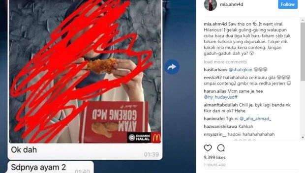 Mia asalnya cuma muat naik foto paparan skrip perbualan seorang isteri berasa cemburu apabila mempertikaikan tindakan suaminya hantar gambar iklan Mia sedang menikmati seketul ayam goreng McDonald’s atau McD.
