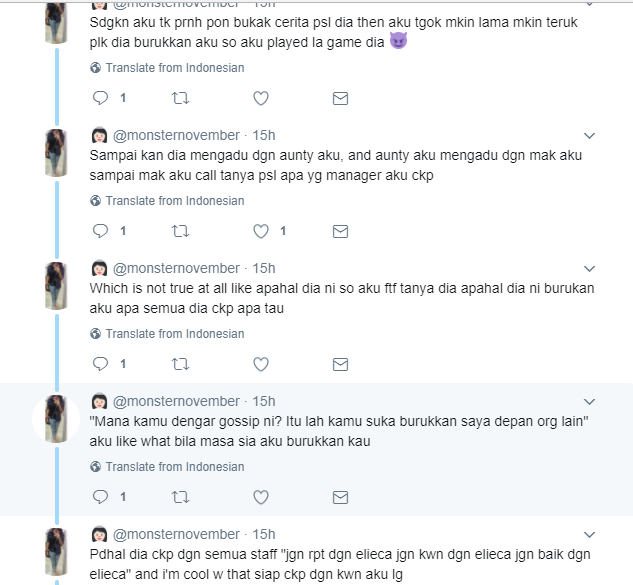 “Mana kamu dengar gossip ni? Itu lah kamu suka burukkan saya depan orang lain,” kata pengurusnya.