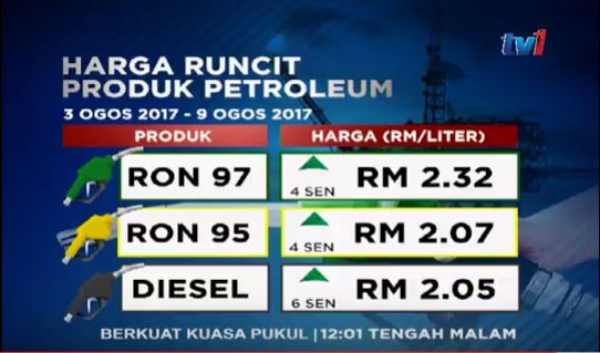 Stesen penyiaran awam kebangsaan berkenaan melaporkan bahawa kesemua harga siling baharu untuk produk petroleum tersebut bermula dari pukul 12.01 tengah malam 3 Ogos sehingga 11.59 malam pada 9 Ogos depan.