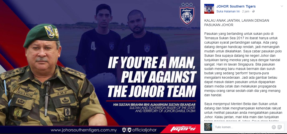 Saya cabar pasukan polo Sukan SEA supaya datang ke negeri Johor dan tunjukkan taring mereka yang saya dengar handal sangat. Hari ini lawan Singapura.