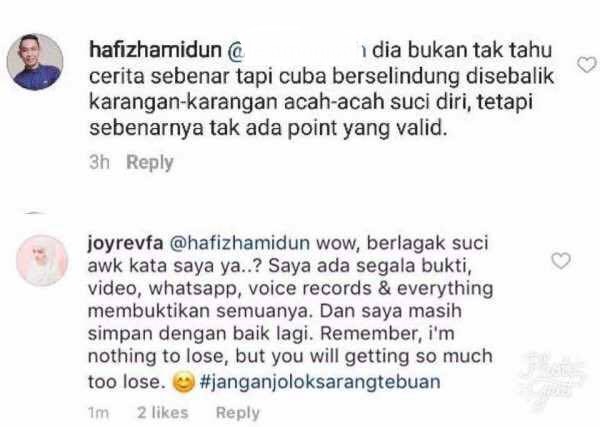 USAHAWAN kosmetik dan isteri kepada penyanyi Hafiz Hamidun, Joy Revfa menegaskan tindakannya membidas kembali kata-kata lelaki itu di media sosial adalah kerana untuk melindungi maruah dirinya.
