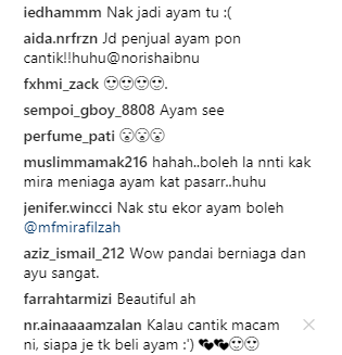 Komen-komen netizen yang buat tak tahan tu. Ada yang sanggup nak jadi ayam lah, ada yang nak pergi pasar hari-hari kalau Mira yang jual ayam.