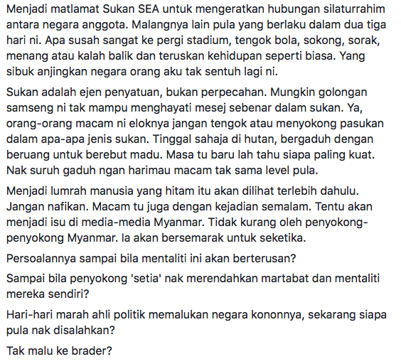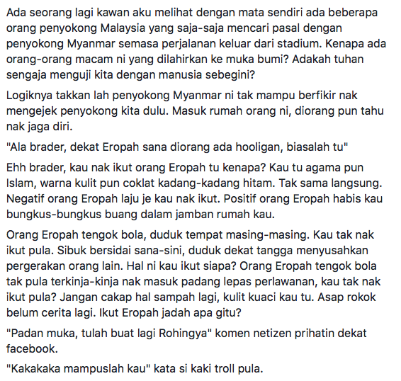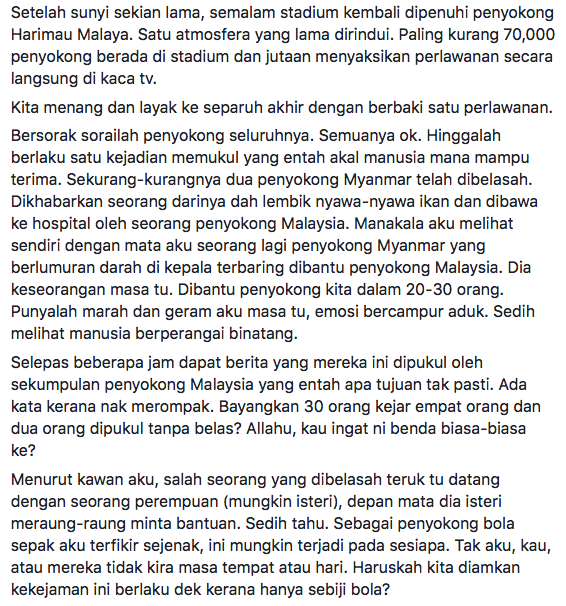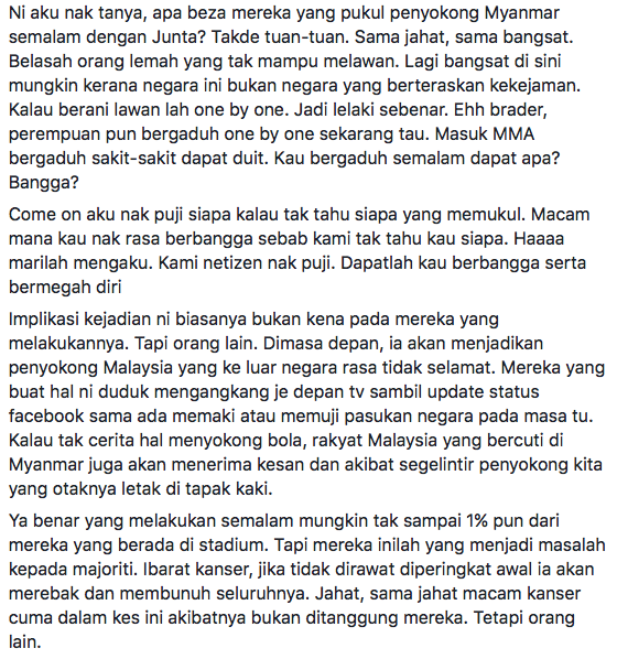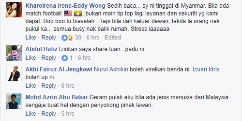 Rata-rata antara mereka begitu bengang dan sedih dengan tindakan keterlaluan pemuda yang membelasah penyokong Myanmar tersebut.