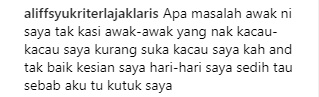 Ekoran itu, Aliff telah melenting dan meninggalkan komen yang berbaur tidak puas hati pada video tersebut.