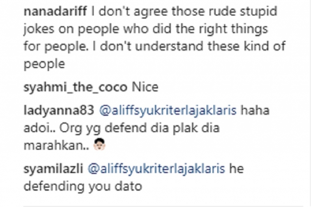 Rata-rata adaripada netizen marah dengan tindakan Aliff dan cuba menjelaskan perkara sebenar iaitu tentang keprihatinan Caprice yang patut dipuji bukannya dicemuh.