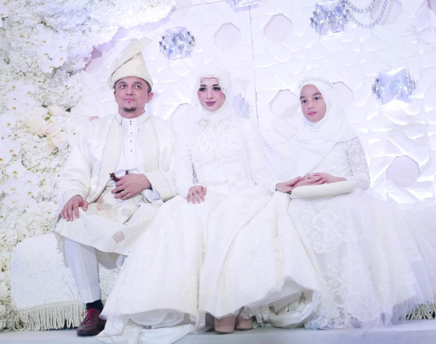 Aleesya juga turut menggayakan busana gaun berwarna putih sedondon dengan bapanya dan ibu barunya itu.