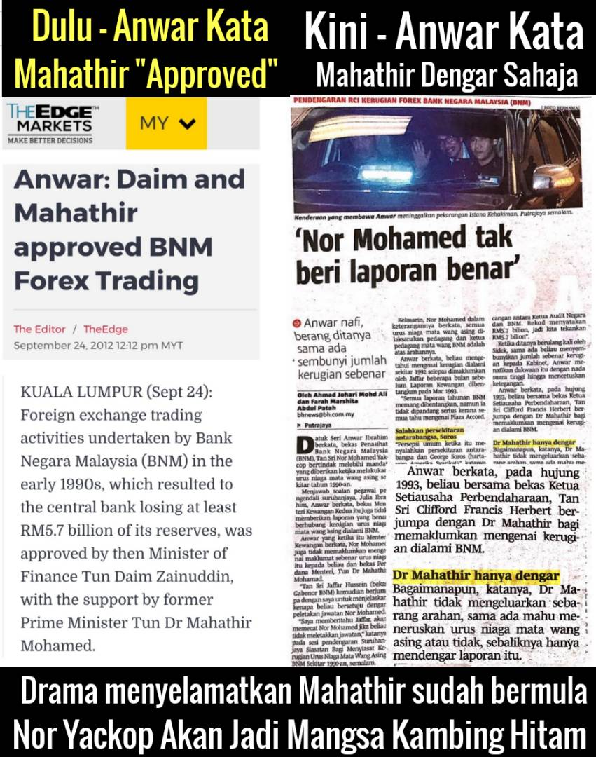 Untuk rekod, pada 24 September 2012, dalam The Edge Markets, Anwar kata Daim dan Mahathir yang “approved” urus niaga forex di BNM pada waktu itu. Semalam, Anwar pusing cerita lain kata Mahathir hanya dengar sahaja.