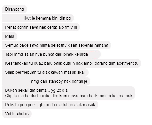 Lain pula cerita seorang individu itu yang mengatakan bahawa penangkapan itu telah dirancang oleh si suami kononnya kerana tidak berpuas hati si isteri telah meminta cerai.