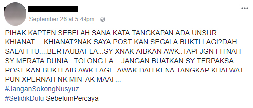 Di akaun Facebook suami kapten itu, dia telah menyatakan bahawa jika masih ada lagi dakwaan yang mengatakan dia mereka cerita mengenai kecurangan isterinya, dia tidak akan teragak-agak untuk menyatakan bukti yang lain.