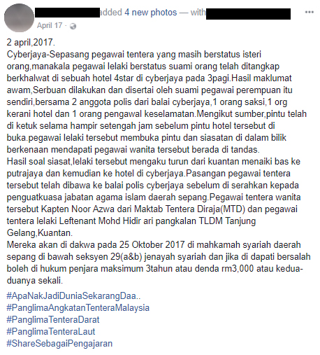 Menurut posting tersebut, selepas disoal siasat, kapten itu mengaku sanggup datang dari Kuantan, Pahang dengan menaiki bas ke Putrajaya dan seterusnya menuju ke hotel di Cyberjaya untuk bertemu si kekasihnya itu.