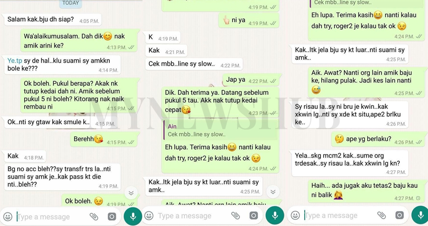 Berdasarkan screenshot perbualan menerusi aplikasi WhatsApp tersebut, wanita berkenaan dipercayai membuat tempahan dengan seorang tailor yang tidak didedahkan identitinya.