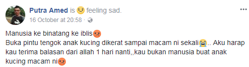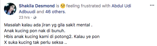 “Masalah kalau ada jiran yang gila, sakit mental. Anak kucing pun nak dibunuh. Habis anak kucing kami dipotong-potong. Kalau ya pun tak suka kucing, tak perlu seksa,” tulisnya.