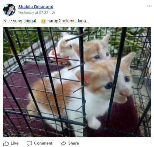Dalam pada itu, Shakila turut memuat naik gambar tiga ekor anak kucingnya yang lain dan memberitahu mamalia kecil itu telah dihantar ke rumah ibunya kerana risau akan keselematan mereka.