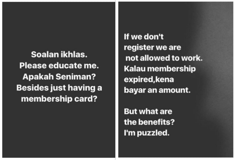 Dia juga mempersoalkan untuk apa pembayaran kad ahli dibuat tetapi tidak mendapat sebarang kelebihan pun daripada Seniman.