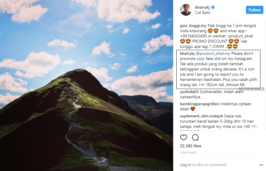 “Tolong jangan promosi produk palsu lagi ‘sampah’ ini di laman Instagram saya. Tak ada produk yang boleh tambah ketinggian untuk orang dewasa,” katanya.