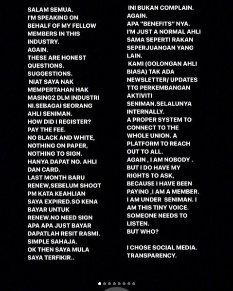 Entri yang dimuat naik sebelum ini juga turut mempersoalkan apakah manfaat yang diperoleh daripada Seniman selain membayar dan memperbaharui kad keahlian supaya dapat berlakon selepas kad ahli tersebut telah tamat tempoh.