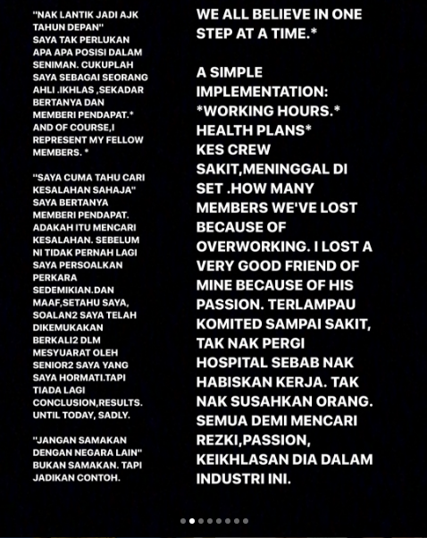 “Berapa ramai ahli yang kita telah hilang kerana terlalu sibuk bekerja? Saya kehilangan rakan baik saya kerana minat dan terlampau komited sampai sakit dan tak nak pergi hospital sebab nak habiskan kerja,” tulisnya.