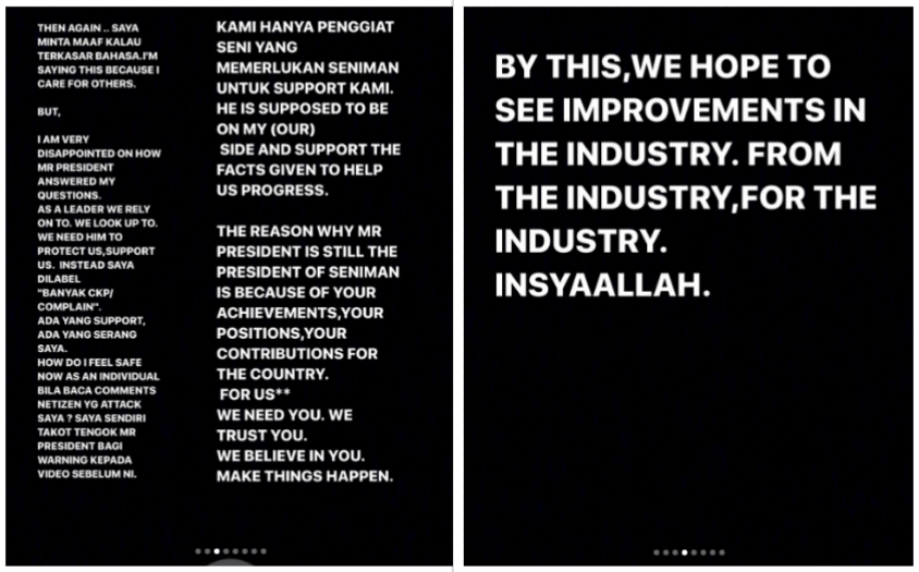 Isu ini seharusnya diselesaikan dengan secepat mungkin supaya tiada lagi adegan tuding menuding dan saling menyalahkan antara satu sama lain supaya industri hiburan negara ini dikenali kerana kemajuan yang dicapai bukan kerana hal-hal negatif. – MYNEWSHUB.CC