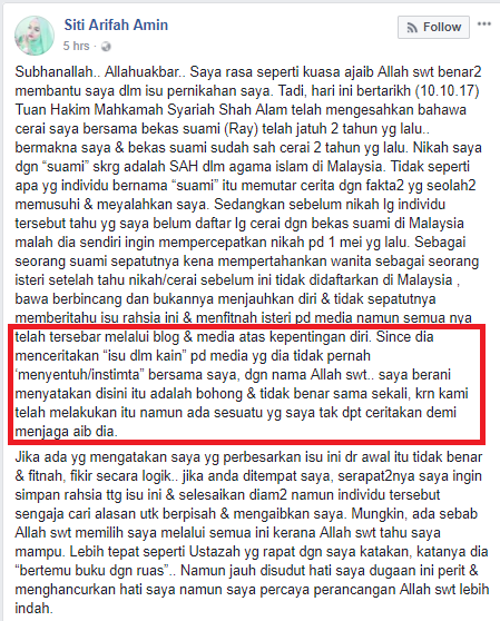 “Menurut Siti Arifah, dia telah diceraikan melalui khidmat pesanan ringkas aplikasi WhatsApp. Oleh itu, saya telah berkali-kali meminta Siti Arifah surat perakuan cerainya tetapi dia seperti tidak mahu selesaikan urusan tersebut,” kata Hafiz di dalam kenyataan rasminya pada 22 Ogos yang lalu.