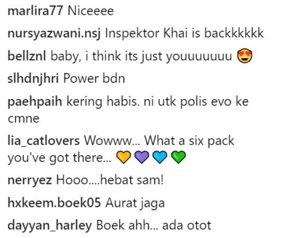 “Is it hot in here or its just me?! 😅. OWH, I LOVE MY JOB!!! 💪😘👍. #InspektorKhai #PolisEvo2′,” tulis Sam menerusi foto berkenaan.
