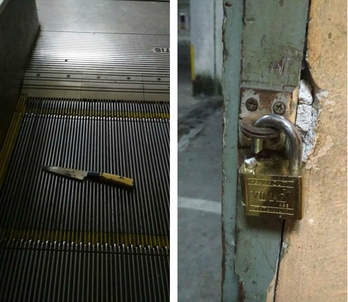 Mereka memotong mangga salah satu pintu masuk di belakang bangunan. Tindakan suspek yang bersenjatakan batang besi dan sebilah pisau itu bagaimanapun mengundang padah.