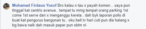Bagaimanapun, seorang netizen yang juga salah seorang penduduk apartmen Centrio Avenue memberitahu bahawa lokasi tersebut merupakan tempat meletak kenderaan buat penduduk apartment berkenaan.