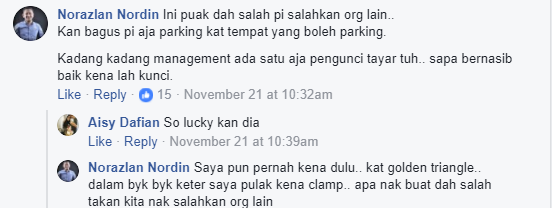 “Kereta lain parking senget tapi tak kena kunci pun tayarnya. Motor pun ada yang parking di tempat letak kereta. Kenapa tak kena kunci tayarnya? “ katanya lagi.