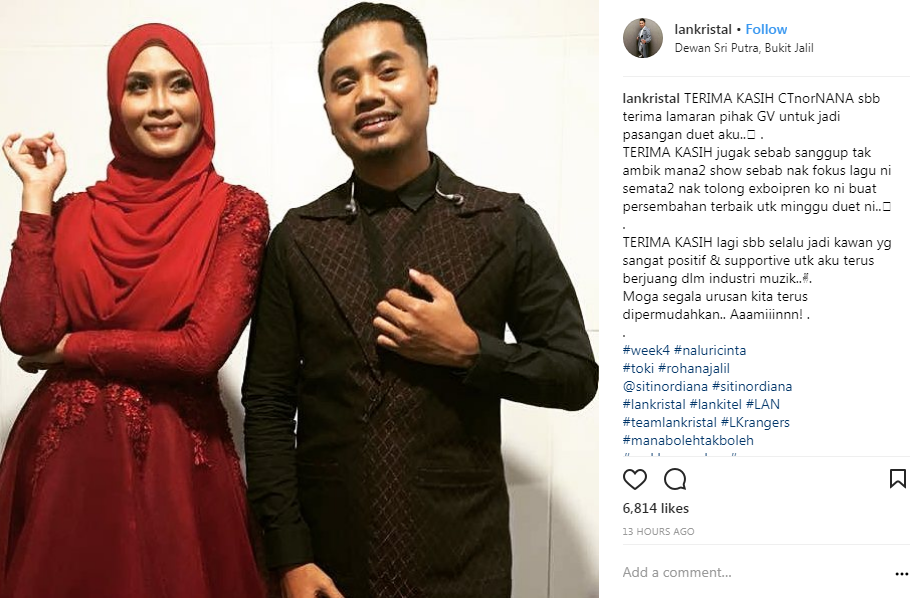 “Terima kasih juga sebab sanggup tak ambil mana-mana show sebab nak fokus lagu ni semata-mata nak tolong ex-boyfriend kau ni buat persembahan terbaik untuk minggu duet ini,” tulis Lan.