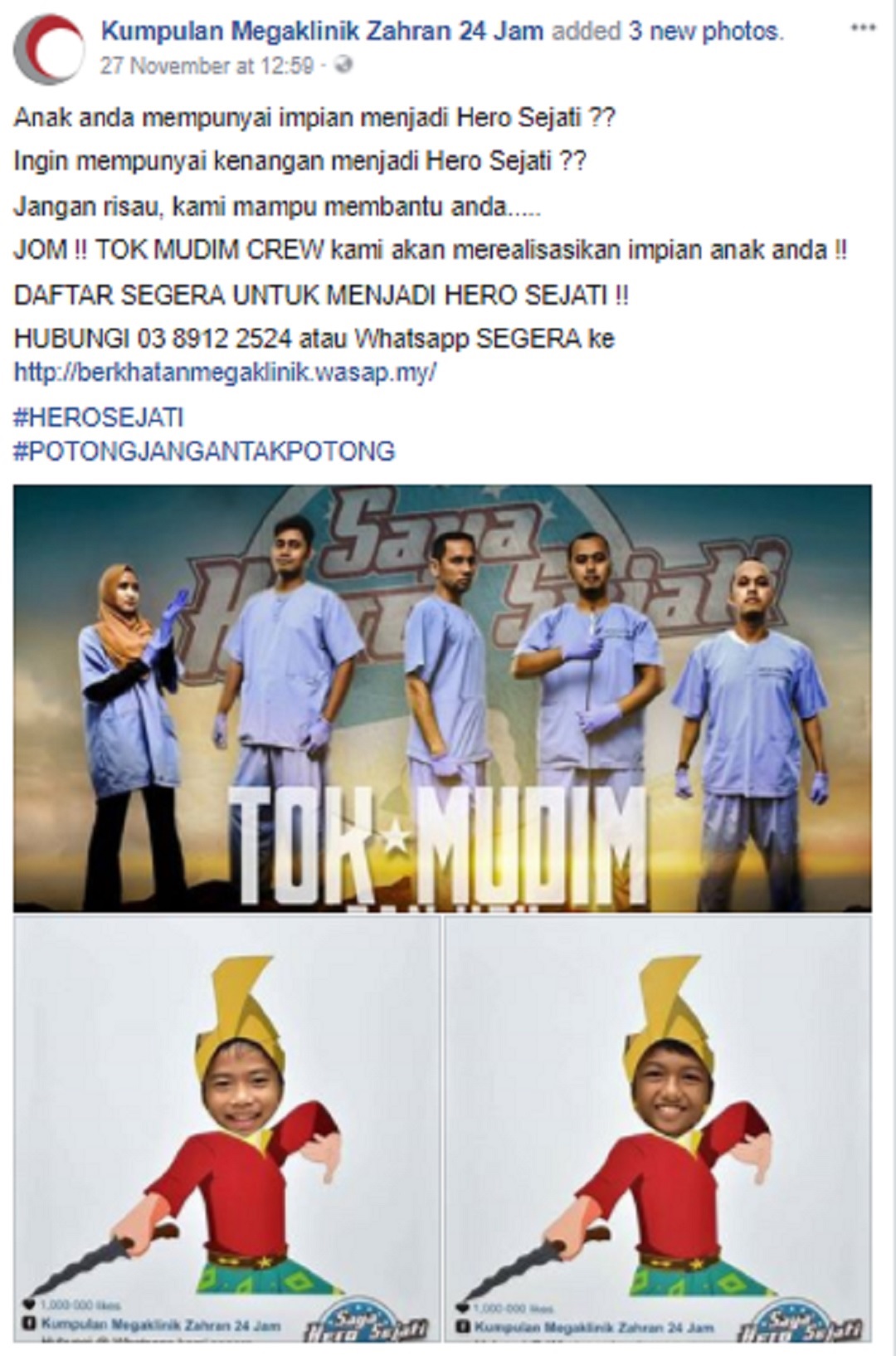 “HUBUNGI 03 8912 2524 atau Whatsapp SEGERA ke http://berkhatanmegaklinik.wasap.my/ #HEROSEJATI #POTONGJANGANTAKPOTONG,“ tulis pengendali laman berkenaan.