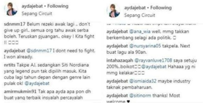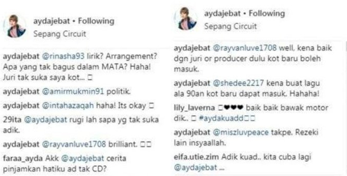 “Well, kena baik dengan juri dan producer ataupun buat lagu ala 90-an baru boleh masuk kot,” tulisnya di ruangan komen kepada salah seorang peminat.