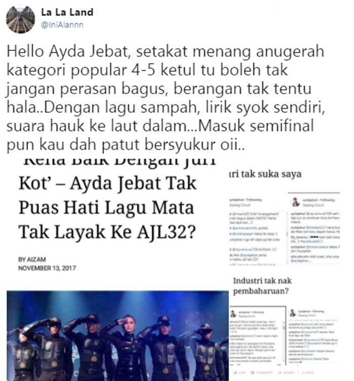 Di laman Twitter sekarang pun ramai yang mempersoalkan tindakan Ayda mempersoalkan kredibiliti juri untuk AJL32 kali ini.