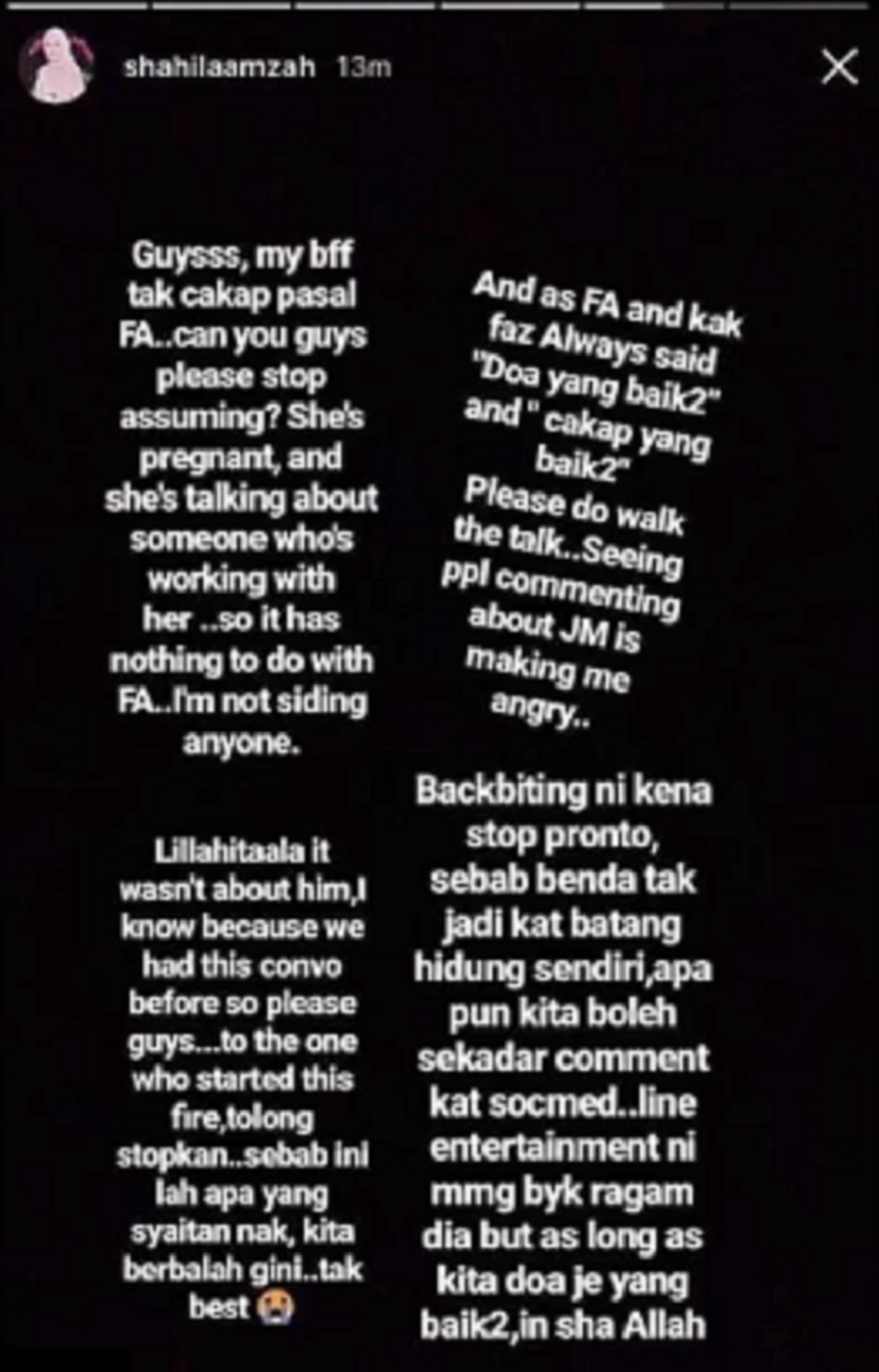 Dalam pada itu, Shila turut meminta agar netizen supaya berhenti daripada terus mengeruhkan keadaan dengan dengan spekulasi yang tidak sepatutnya.
