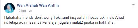 “Bertenang kawan-kawan, peminat dan keluarga. Saya OK sahaja dan tidak jadi kudis pun dengan keyboard warrior ni.