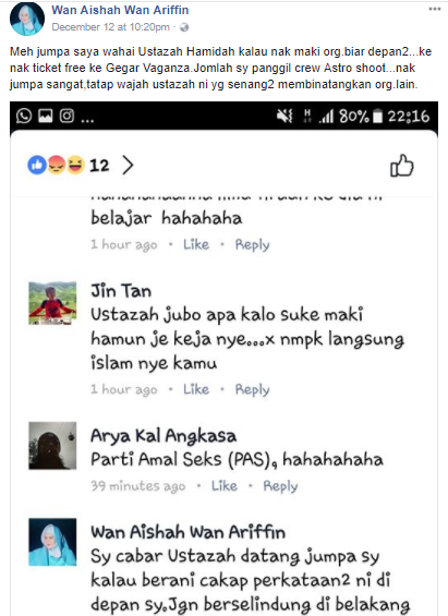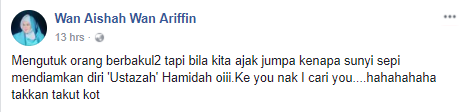“MARI jumpa saya wahai Ustazah Hamidah, kalau nak maki orang biar depan-depan.”