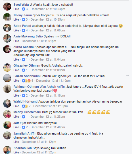 Nasib baik peminat masih lagi sokong Aishah dan mereka turut menasihati penyanyi itu agar tidak hirau komen negatif seperti itu yang hanya ingin menjatuhkan semangatnya bagi menghadapi pusingan akhir GV4 pada Ahad ini.