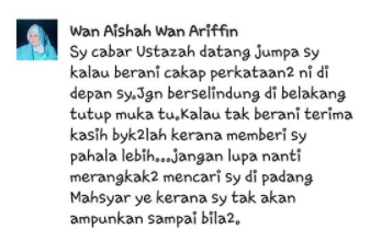 “Saya nak jumpa sangat-sangat ustazah ni yang senang-senang nak membinatangkan orang lain,” tulis Aishah selepas dia memuat naik sekeping gambar screenshot status wanita tersebut.