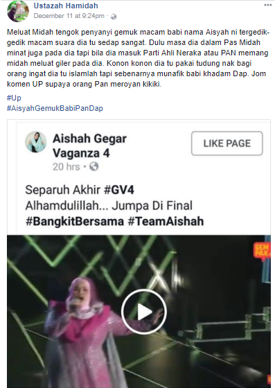 Itulah yang dikatakan oleh penyanyi Aishah yang merupakan peserta Gegar Vaganza 4 selepas ada seorang individu yang bergelar ‘ustazah’ telah menghina dirinya.